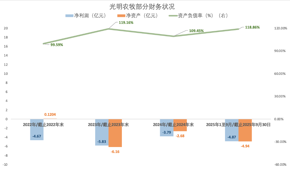 資產(chǎn)方面同樣難言樂觀。一方面,光明農(nóng)牧資產(chǎn)負債率居高不下,截至2022年末、2023年末、2024年末以及2025年9月30日前述指標(biāo)分別達99.59%、119.16%、109.45%和118.86%;另一方面,自2023年起,該子公司凈資產(chǎn)由正轉(zhuǎn)負,截至2023年末和2024年末及2025年9月30日,前述指標(biāo)分別為-6.16億元、-2.68億元、-4.94億元,已資不抵債。