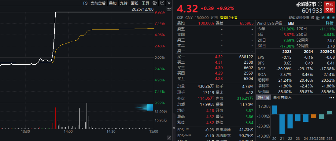 值得一提的是,午后,多只個股盤中上演直線拉升。其中,永輝超市(601933)(601933)上演股價狂飆,僅用時2分鐘便成功沖擊漲停。這也是公司今年以來收獲的為數(shù)不多的漲停板。