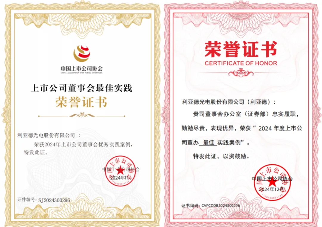 近日,利亞德(300296)再添重磅榮譽(yù):憑借卓越的治理能力與創(chuàng)新實(shí)踐,一舉斬獲中國上市公司協(xié)會(以下簡稱 “中上協(xié)”)“2025年度上市公司董事會典型實(shí)踐案例”、“2025年度上市公司董事會辦公室優(yōu)秀實(shí)踐” 兩大獎項(xiàng),標(biāo)志著監(jiān)管機(jī)構(gòu)、資本市場及行業(yè)協(xié)會對利亞德現(xiàn)代化公司治理體系的高度認(rèn)可,為科技企業(yè)治理升級樹立了實(shí)踐典范。