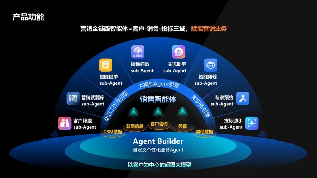 該智能體以“賦能端到端營銷”為核心,打造兩大核心技術(shù)引擎,面向超長文本的處理引擎+以客戶為核心的超圖推理引擎,貫通從線索挖掘到回款服務(wù)的LTC全鏈路,實現(xiàn)了全景客戶洞察、全面銷售賦能、投標(biāo)效率躍升的三大突破。