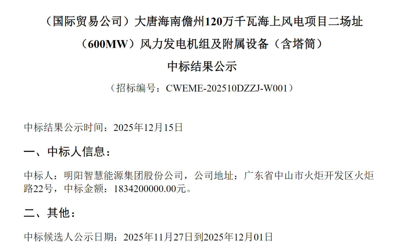 同日,明陽中標(biāo)大唐海南儋州120萬千瓦海上風(fēng)電項目二場址(600MW)風(fēng)力發(fā)電機組及附屬設(shè)備(含塔筒),金額為18.342億元,合3057元/千瓦。