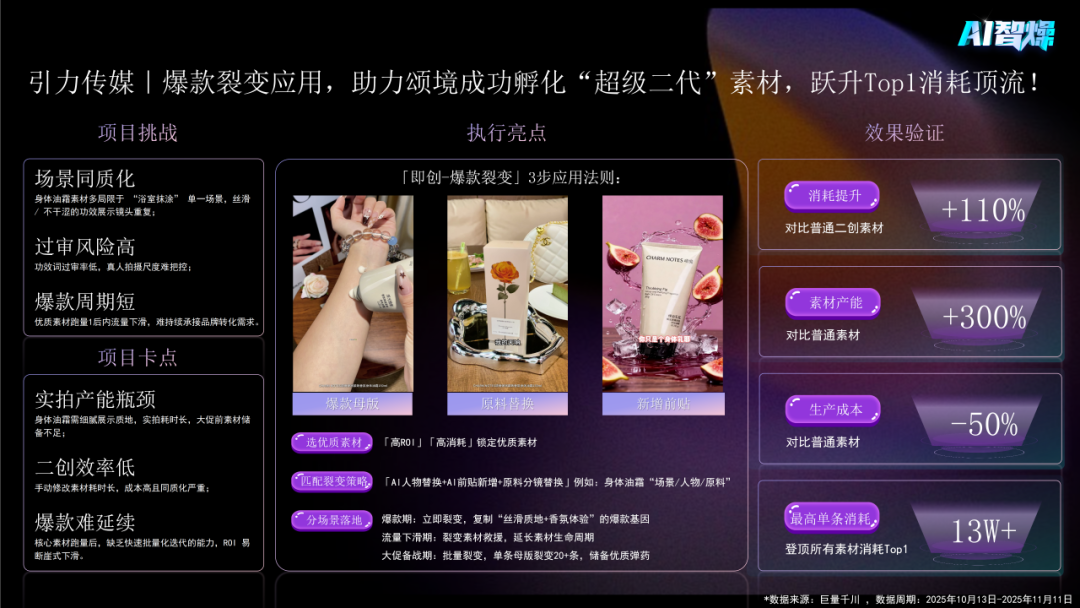 與普通二創(chuàng)素材比,其消耗提升110%,產(chǎn)能增300%,成本降50%,單條最高消耗居首,實現(xiàn)效率效果雙提升。