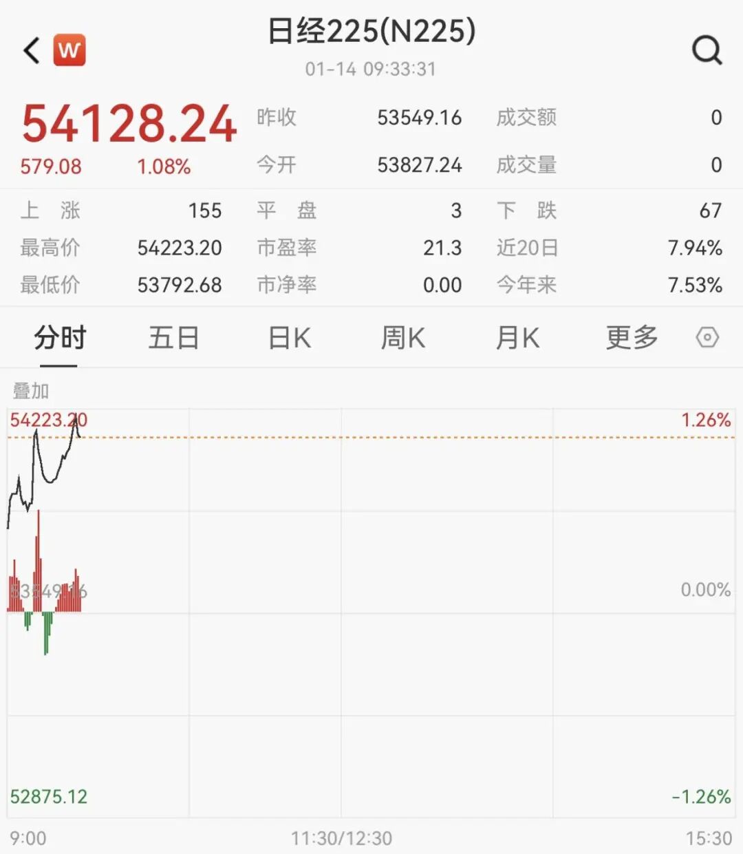 1月14日,日經(jīng)225指數(shù)開盤走高,首次觸及54000點(diǎn),漲幅為1%,再創(chuàng)新高。