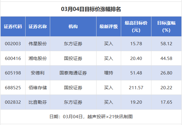 越聲投研數(shù)據(jù)顯示,3月4日,券商給予上市公司目標(biāo)價(jià)共5次,按最新收盤(pán)價(jià)計(jì)算,目標(biāo)價(jià)漲幅排名居前的公司有偉星股份(002003)、湘電股份(600416)、安德利(605198),目標(biāo)價(jià)漲幅分別為58.12%、44.58%、26.80%,分別屬于紡織制造、電機(jī)、農(nóng)產(chǎn)品加工行業(yè)。