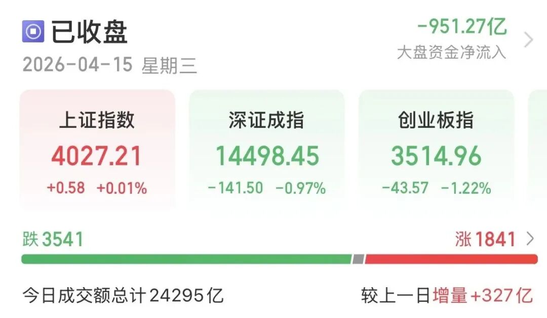 4月15日,A股高開低走,截至收盤,三大指數(shù)漲跌不一。具體來看,上證指數(shù)(1A0001)微漲0.01%,深證成指(399001)跌0.97%,創(chuàng)業(yè)板指(399006)跌1.22%,北證50跌0.03%。全市場成交額為24295億元,較上一日增量327億元,全市場超3500只個(gè)股下跌。