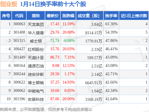 1月14日創(chuàng)業(yè)板換手率前十大個(gè)股,天龍集團(tuán)居首
