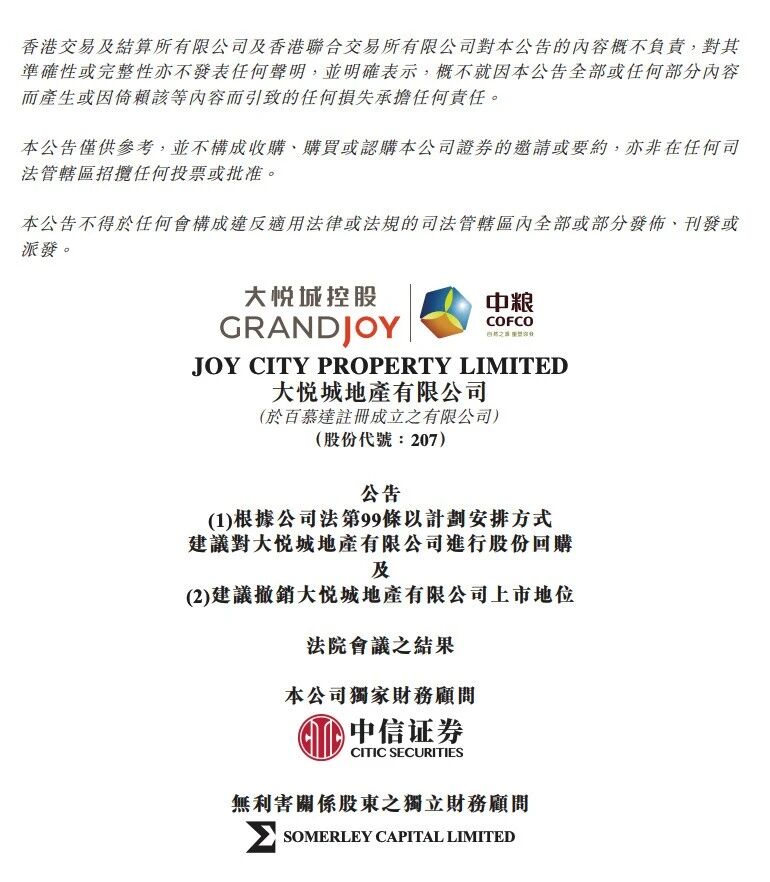 11月17日晚,大悅城(000031)地產(chǎn)有限公司(以下簡(jiǎn)稱“大悅城地產(chǎn)”)發(fā)布公告稱,在當(dāng)日舉行的法院會(huì)議上,親身或委派代表出席法庭會(huì)議并投票的計(jì)劃股東,已批準(zhǔn)通過私有化的決議案。待該計(jì)劃生效后,大悅城地產(chǎn)在聯(lián)交所的上市地位,預(yù)期將于11月27日下午四時(shí)正起撤銷。