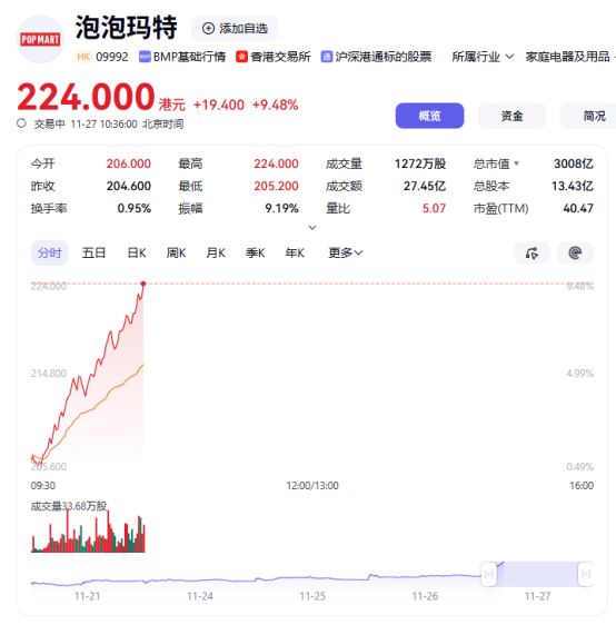 上證報(bào)中國(guó)證券網(wǎng)訊(李子健 記者 周亮)11月27日,泡泡瑪特開(kāi)盤后股價(jià)一路走高,截至10:36,公司股價(jià)上漲9.48%,報(bào)224港元/股。