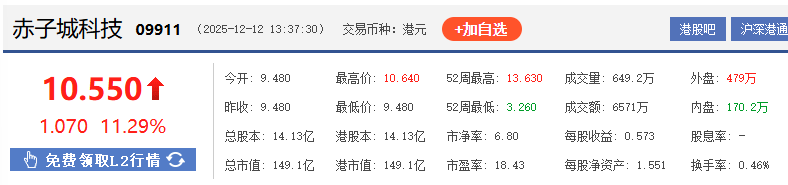 上證報(bào)中國(guó)證券網(wǎng)訊(記者 楊子晏)12月12日,赤子城科技午后股價(jià)持續(xù)攀升。截至13時(shí)37分,赤子城科技報(bào)10.55港元/股,漲11.29%,成交額超6500萬(wàn)港元。