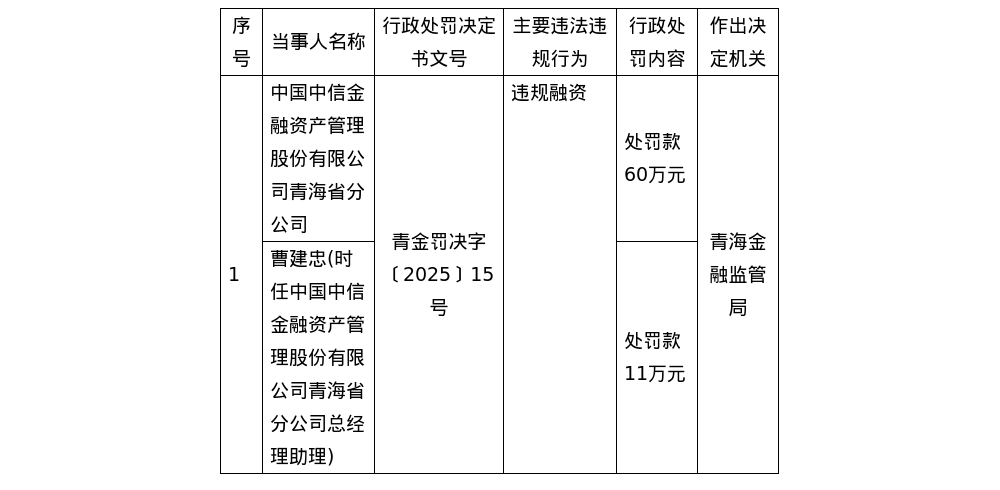 中信金融資產(chǎn)青海省分公司被罰60萬,責(zé)任人被罰11萬