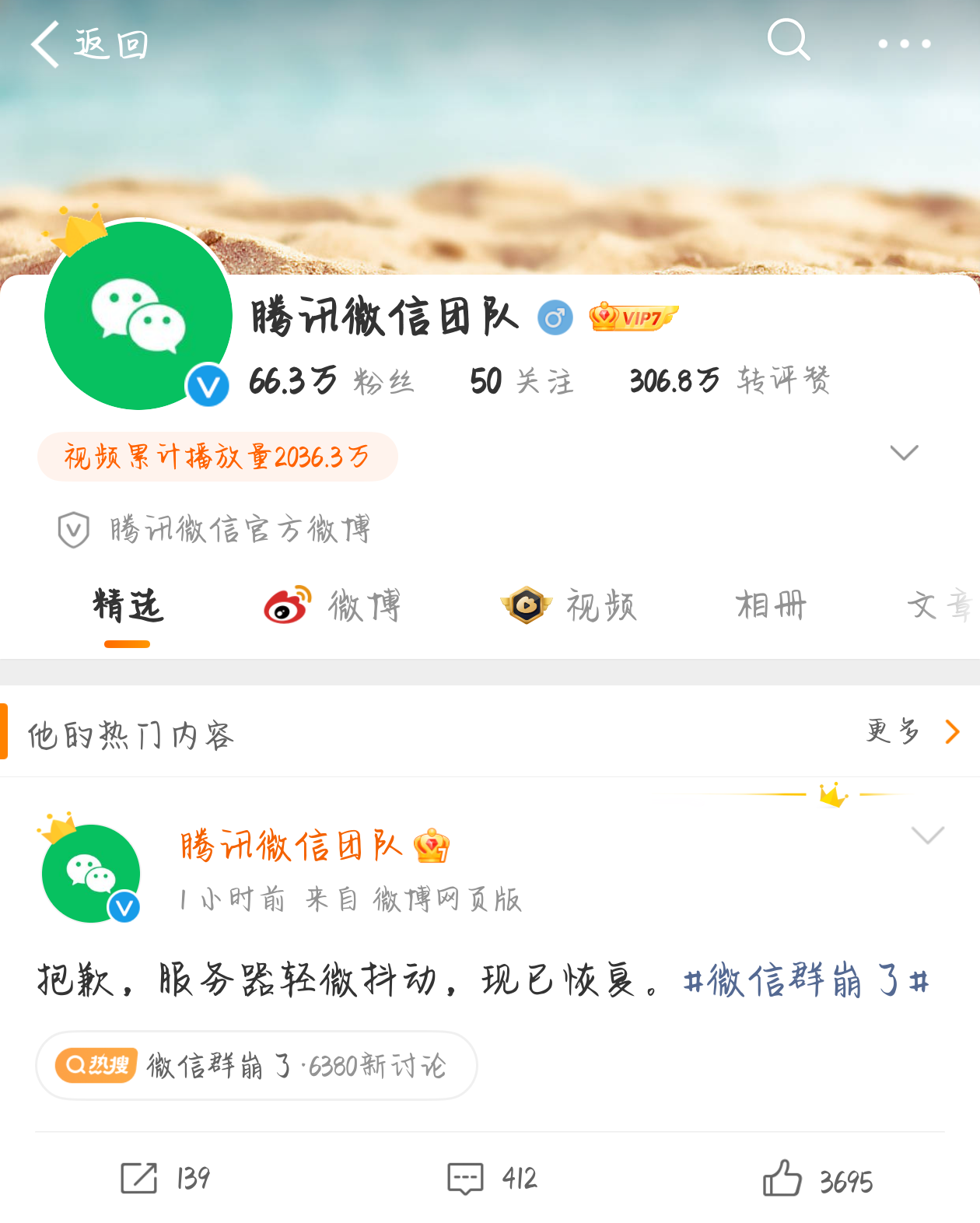 12月12日下午,大量用戶反映微信群消息無法發(fā)送或同步,相關話題登上熱搜,引發(fā)“微信群崩了”的集中討論。騰訊微信團隊在其官方微博發(fā)布公告稱,“抱歉,服務器輕微抖動,現已恢復!