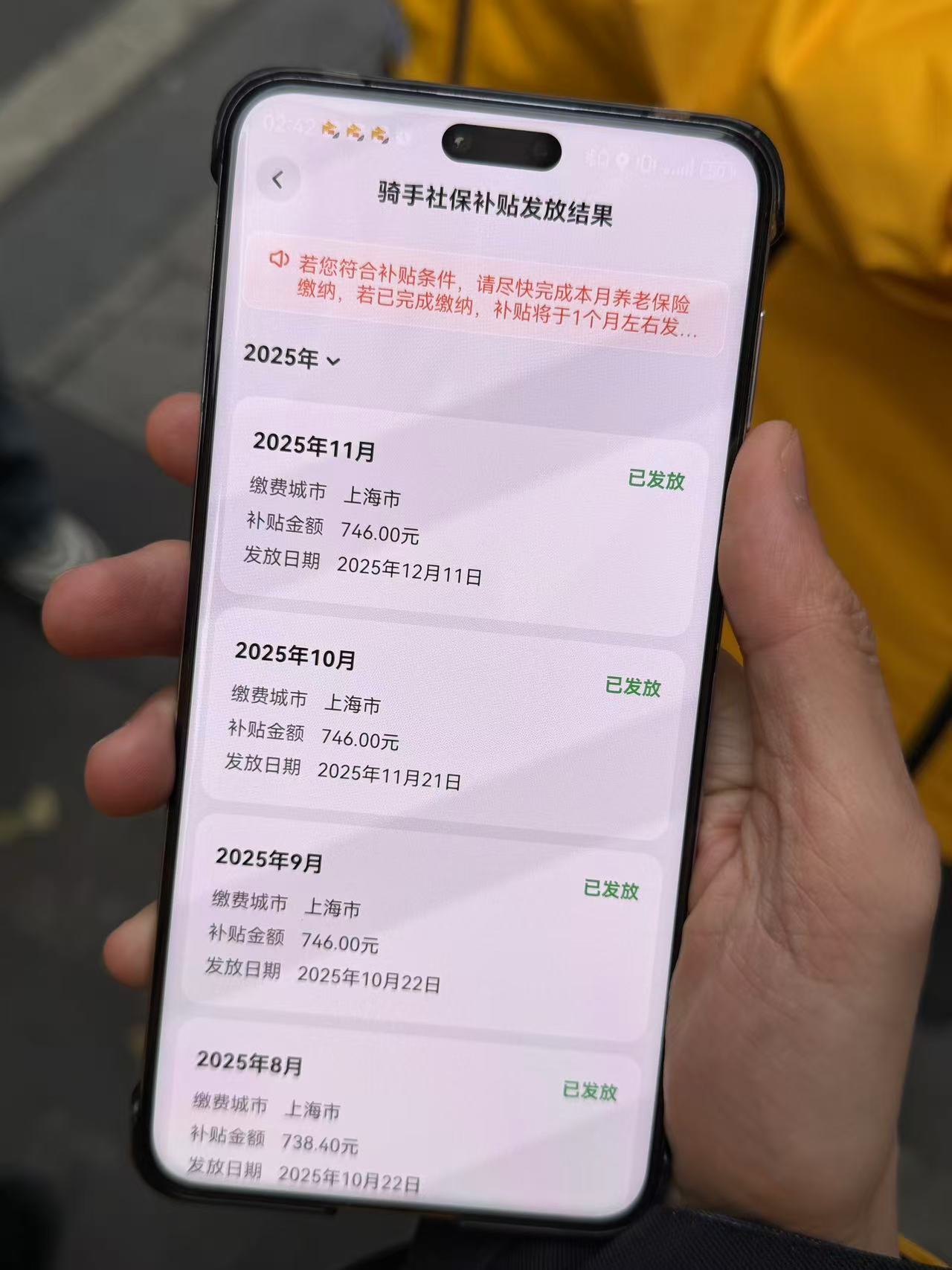圖為騎手蔣海龍展示到賬的養(yǎng)老保險(xiǎn)補(bǔ)貼金。