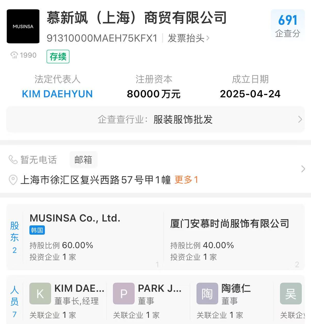 而在這背后,中國運動品牌巨頭安踏體育的身影清晰可見——2025年初,安踏以500億韓元收購Musinsa約1.7%的股份;隨后,雙方合資成立“Musinsa China”,安踏持股40%(廈門安慕時尚服飾有限公司成立于2025年2月28日,由安踏投資有限公司100%持股)。