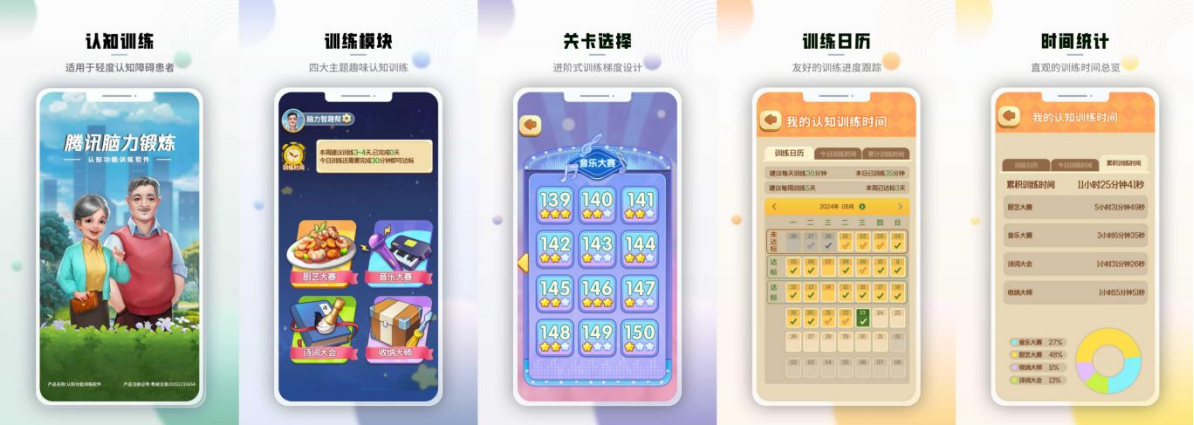 具體來看,“騰訊腦力鍛煉”內(nèi)包含“廚藝大賽”“音樂大賽”“收納大師”“詩詞大會”四大訓練模塊,每個訓練主題均有超150個關(guān)卡,幫助患者進行知覺運動、執(zhí)行功能、復雜的注意、語言、學習與記憶,以及社會認知等六大認知域訓練。