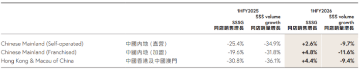 加盟店數(shù)量的萎縮,使周大福短期業(yè)績承壓。2026財(cái)年半年報(bào)顯示,受門店整合影響,其內(nèi)地批發(fā)業(yè)務(wù)(指向加盟商銷售貨品及向加盟商提供服務(wù)的收入)營業(yè)額下跌10.2%,導(dǎo)致公司內(nèi)地營業(yè)額亦同比下跌2.5%。