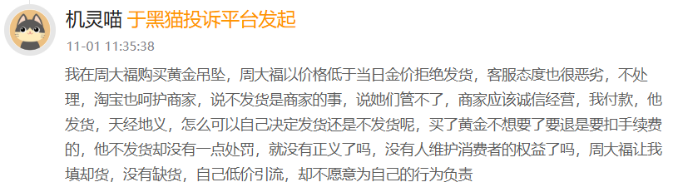 也需要看到,黃金作為高價值、重體驗(yàn)的商品,線上無法提供實(shí)體店的直觀質(zhì)感與專業(yè)服務(wù),這尤其會抑制高附加值“一口價”產(chǎn)品的銷售,可能使線上渠道淪為消費(fèi)者的比價工具,削弱品牌溢價能力;同時,由于線上定價需緊跟實(shí)時金價,但在金價快速單邊上漲時,從接單到采購補(bǔ)貨的時間差極易導(dǎo)致“售出即虧損”,直接侵蝕利潤。此前已有消費(fèi)者在投訴平臺反映,其在周大福購買黃金吊墜,周大福以價格低于當(dāng)日金價拒絕發(fā)貨,這凸顯了價格波動帶來的履約糾紛。