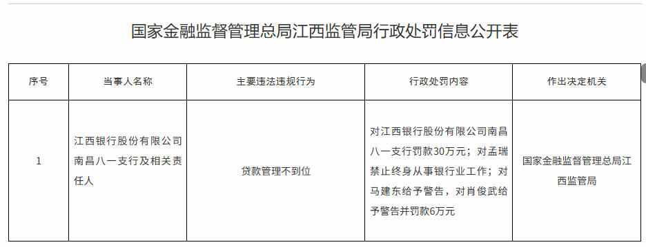 貸款管理不到位,江西銀行一支行被罰30萬元