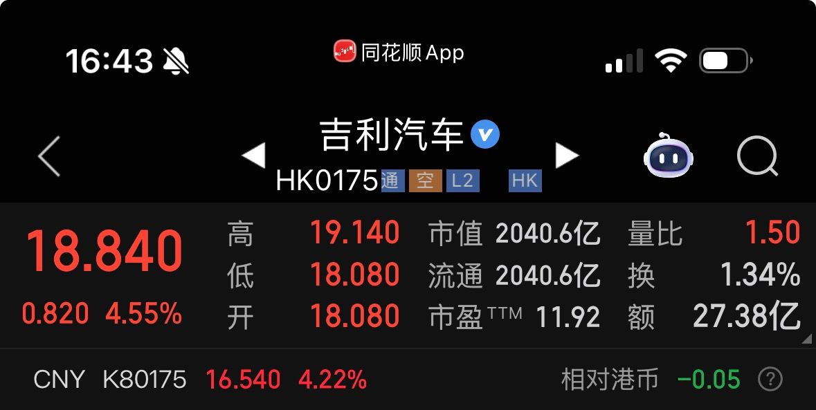 3月17日,吉利汽車盤中一度漲超6%,最終收漲4.45%,總市值達(dá)2031億港元,表現(xiàn)優(yōu)于港股汽車板塊。自3月6日以來,其股價(jià)累計(jì)漲幅超20%,市值增加約300億港元,反映資本市場對(duì)其科技屬性強(qiáng)化與智能化規(guī);涞氐姆e極認(rèn)可。